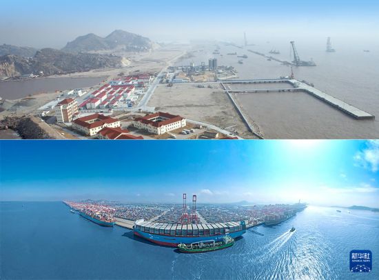 拼版照片:上图为2005年1月16日拍摄的上海洋山港一二期工程(新华社发);下图为2022年9月23日无人机拍摄的上海洋山港四期自动化码头(新华社记者 丁汀 摄)。