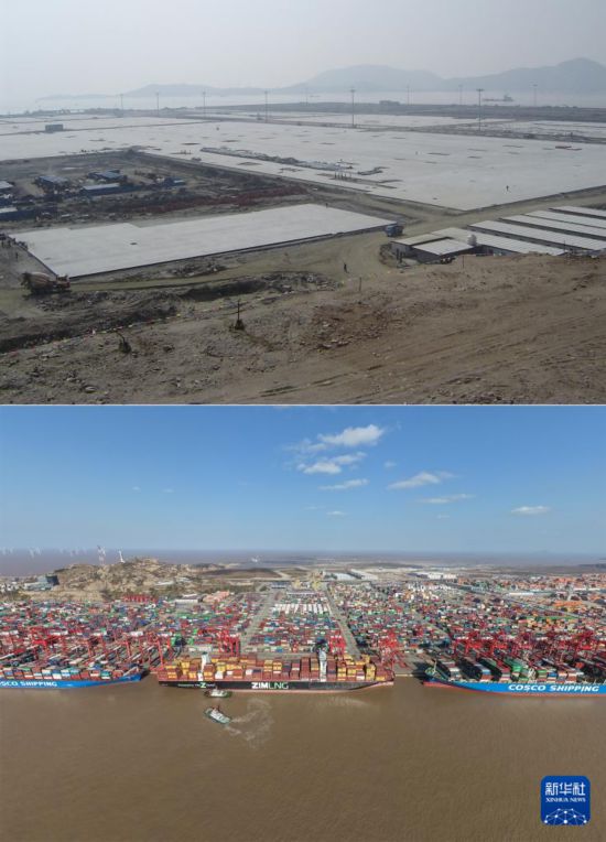 拼版照片:上图为2005年3月1日拍摄的上海洋山港一二期工程;下图为2025年12月8日无人机拍摄的上海洋山港一二期码头。新华社发