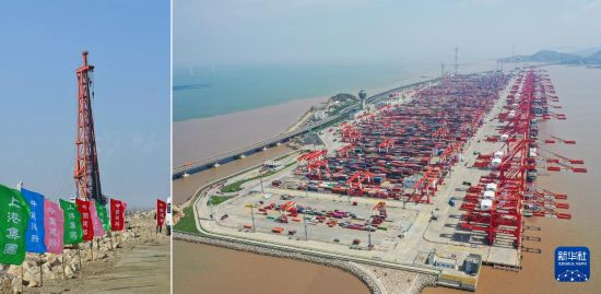 拼版照片:左图为2014年12月23日,上海洋山港四期工程打下第一桩(新华社发);右图为2022年9月23日无人机拍摄的上海洋山港四期自动化码头(新华社记者 丁汀 摄)。