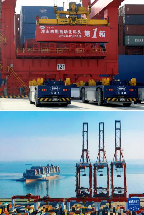 拼版照片:上图为2017年12月10日,上海洋山深水港四期自动化码头开港试生产;下图为2025年3月25日拍摄的上海洋山港四期自动化码头。新华社发
