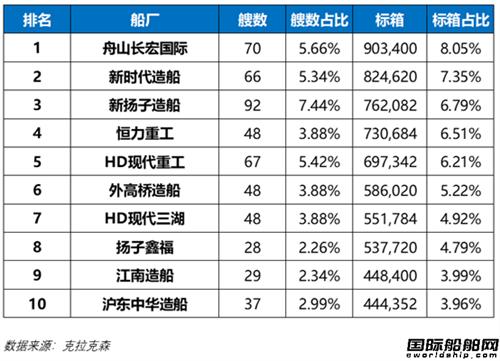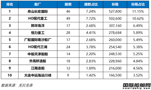 集装箱船手持订单量排名前10船厂