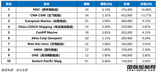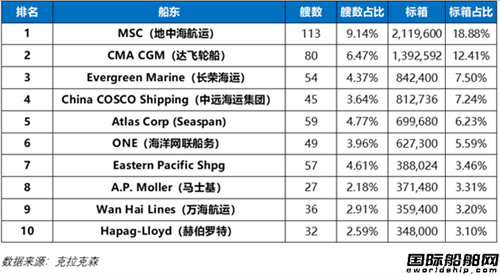 集装箱船手持订单量排名前10船东中,有8家为航运公司,分别是排名第一的地中海航运(113艘211.9万TEU)、排名第二的达飞海运(80艘139.3万TEU)、排名第三的长荣海运(54艘84.2万TEU)、排名第四的中远海运集团(45艘81.3万TEU)、排名第六的海洋网联船务(49艘62.7万TEU)、排名第八的马士基(27艘37.1万TEU)、排名第九的万海航运(36艘35.9万TEU)、排名第十的赫伯罗特(32艘34.8万TEU)。另外两家则是吨位提供商,分别是排名第五的Seaspan(59艘70万TEU)和排名第七的EPS(57艘38.8万TEU)。