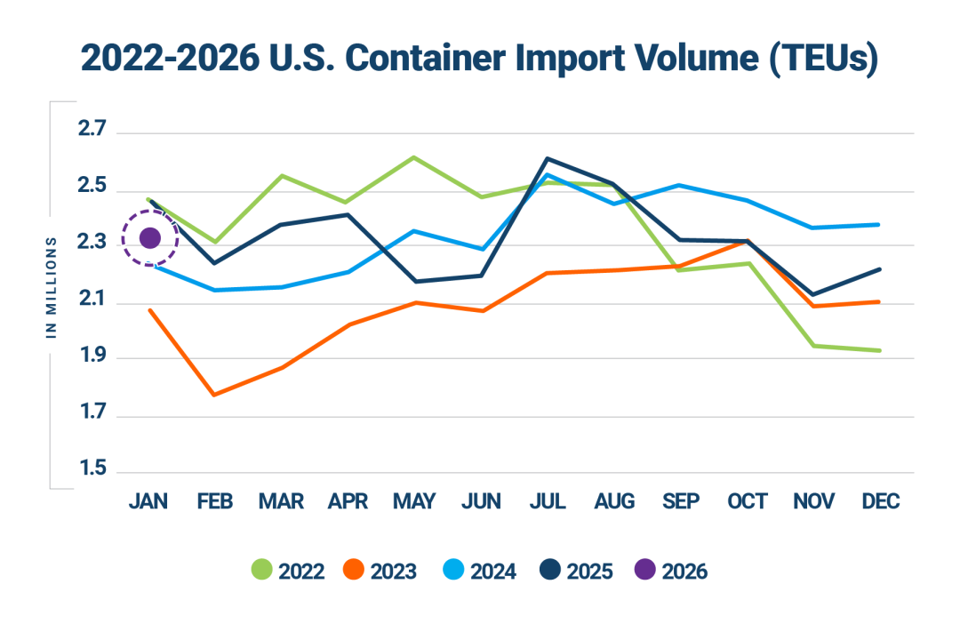 航运界网消息,Descartes数据显示,2026年1月,美国集装箱进口量环比增长4.1%达到231.9万TEU,同比下降6.8%。尽管同比有所下降,但仍略高于六年平均水平,较2019年1月增长了11.8%。