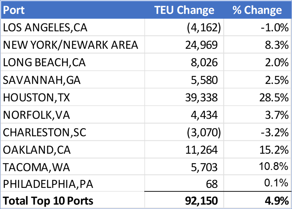 在港口层面,1月份,美国前10大港口的集装箱进口量环比增长4.9%或增加92150TEU。