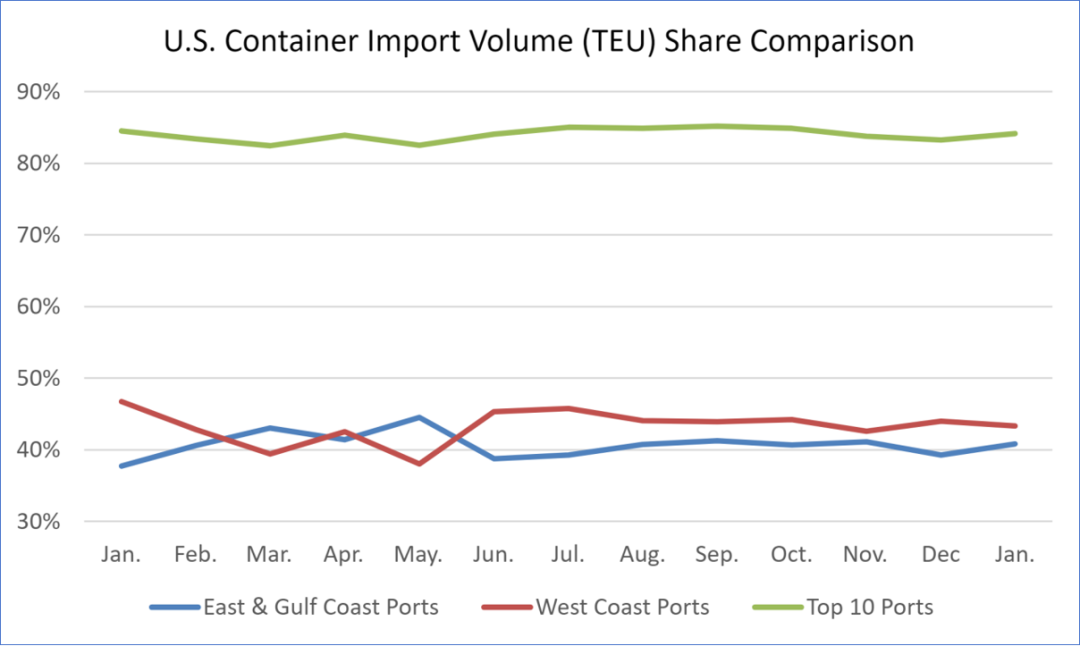 总体而言,美国前10大港口1月份集装箱进口量占总量的84.2%,略高于12月份的83.3%。