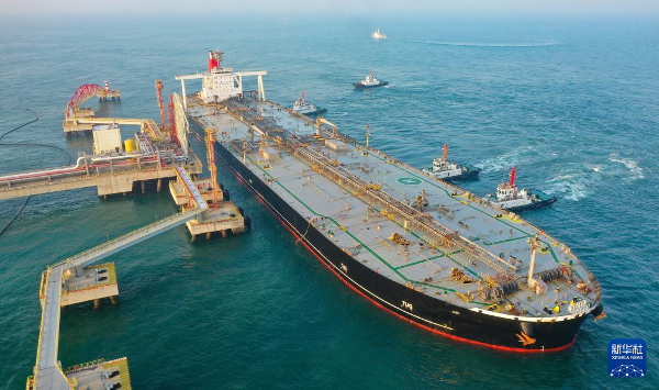 12月18日,一艘装载着石化原辅料的外籍船舶泊入国投洋浦油储码头30万吨级原油泊位(无人机照片)。新华社记者 郭程 摄