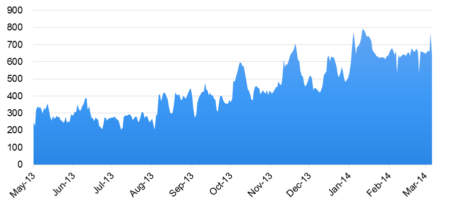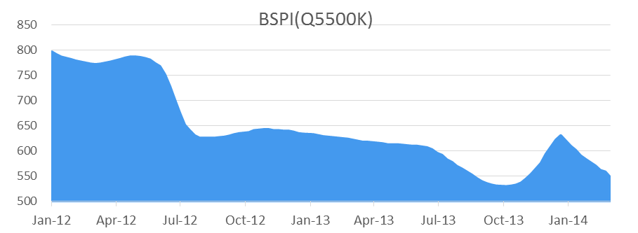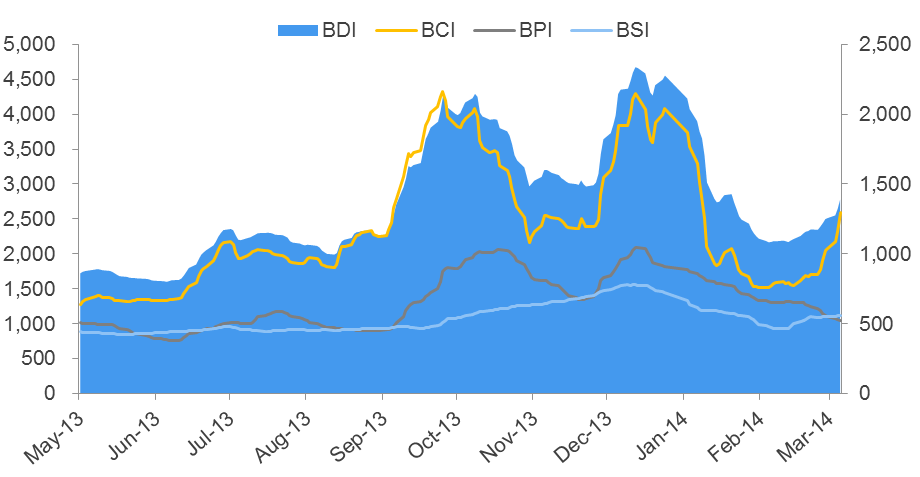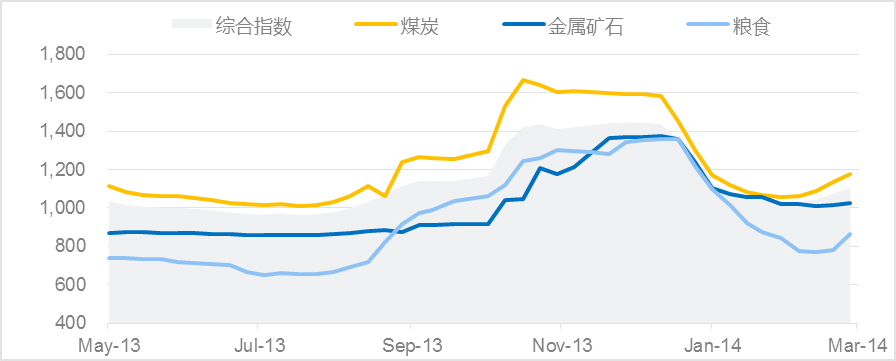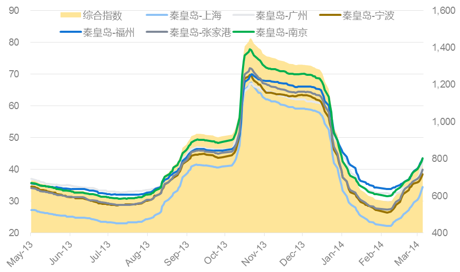 另外,海岬型船运价近期持续上涨亦得益于远期价格凶猛涨势对其推动作用,今年1月以来,FFA Cape各期合约自低点至本周初分别已涨:C1403上涨9910至20030,涨幅97.92%; C1404上涨11590至23120,涨幅100.52%;C1405上涨10920至24520涨幅80.29%;C1406上涨11270至25590涨幅78.70%; C14Q2上涨10285至24410涨幅72.81%;C14Q3上涨9310至28550涨幅48.39%;C14Q4上涨9170至34460涨幅36.26%。