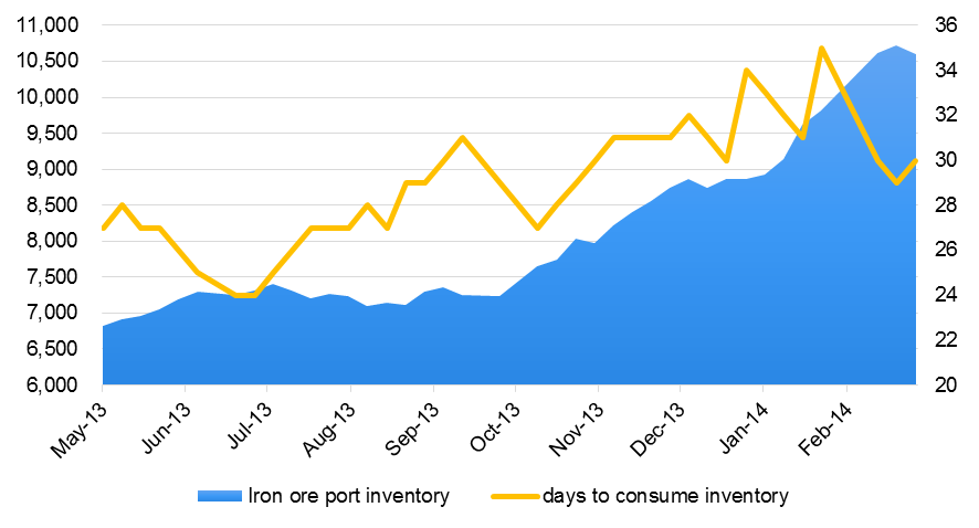 图表9:港口铁矿石库存(万吨)以及大中型钢厂矿石库存可用天数(天)
