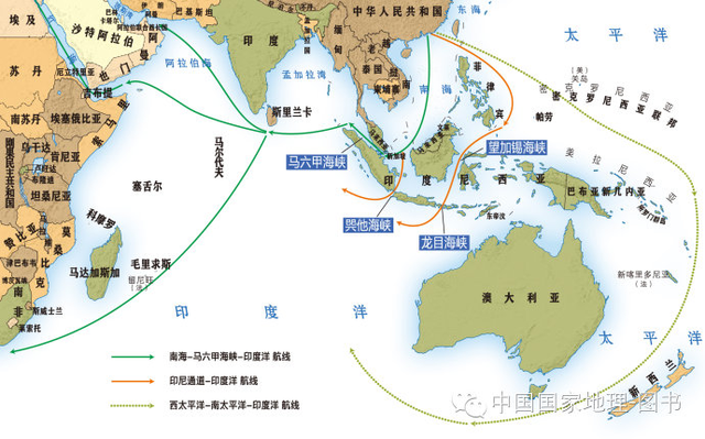 资料图:马六甲海峡附近航线示意图,中国石油绝大多数要通过马六甲海峡进入南海回国