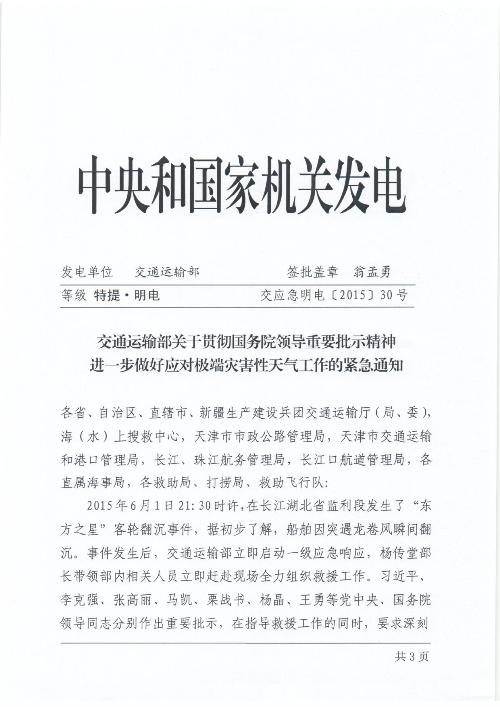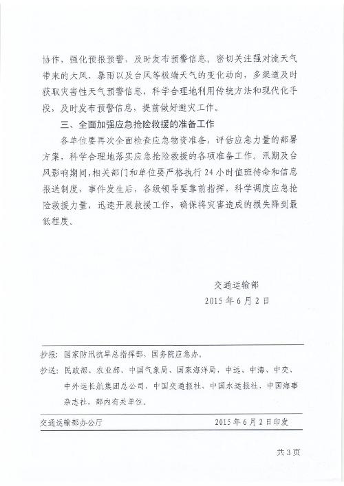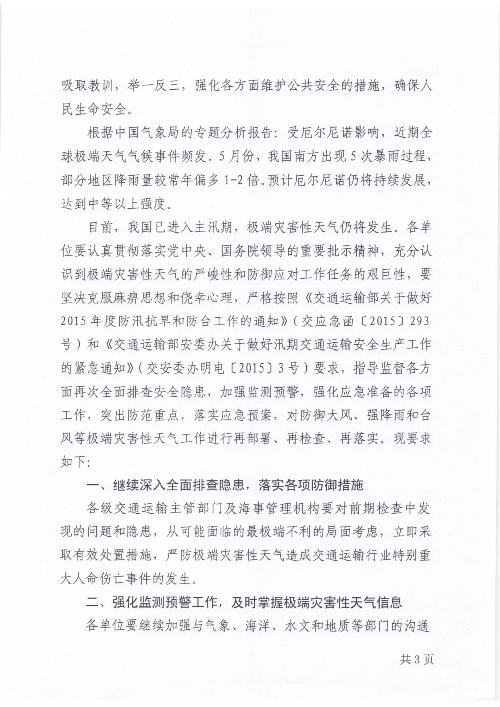 6月2日,交通运输部就贯彻国务院领导重视批示精神、进一步做好应对极端灾害性天气工作发出紧急通知,要求各单位对防御大风、强降雨和台风等极端灾害性天气工作进行再部署、再检查、再落实。