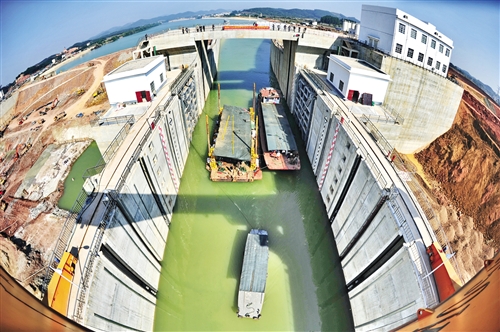2014年12月31日,拖船、货船、施工船在顺利通过老口航运枢纽船闸 周家志 摄