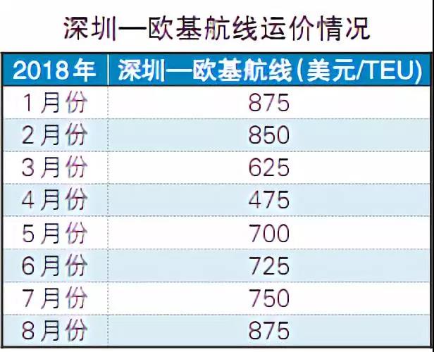 2018年年初,中欧航线运价以800~850美元/TEU开盘,4月中旬触底(约550美元/TEU)反弹,一路高歌到年初的运价水平至今。现据各大班轮公司预报,从8月中旬至9月中旬预订舱为95%~100%,情况良好。据以往的经验,9月底是中国国庆长假前出货高峰,所以各大班轮公司计划于9月初再次调高运价。10月、11月份是传统淡季(因为出口商和企业国庆长假达15~20天),11月中旬更惨淡,12月下旬欧洲开始圣诞节休假,11月中旬出货至欧洲或现无人报关收货。故本人推测11月份中欧航线运价将比目前运价水平下降15%左右。