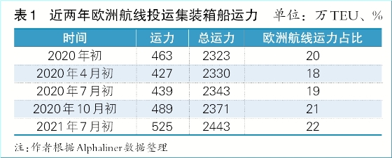 根据Alphaliner的统计数据,7月初欧洲航线投入运力525万TEU,较疫情暴发前的2020年初增长13.4%。对比其他几个重要时点,包括停航规模最大的2020年4月初、适应需求变化停航逐步恢复的2020年7月初和停航已基本恢复的2020年10月初。当前欧洲航线投入运力水平均已显著增长(见表1)。