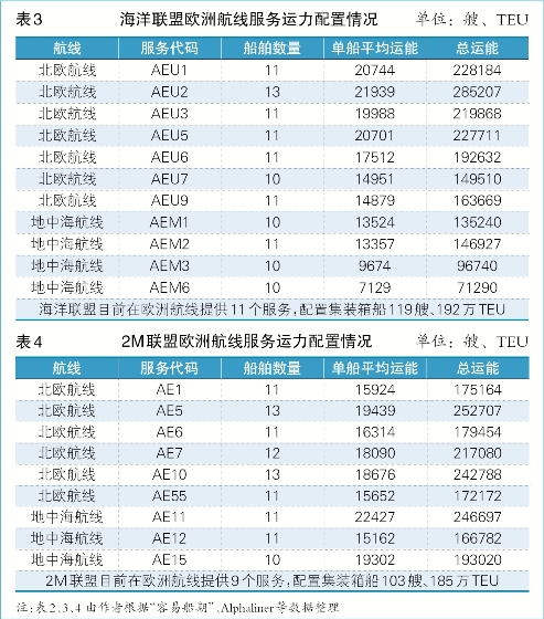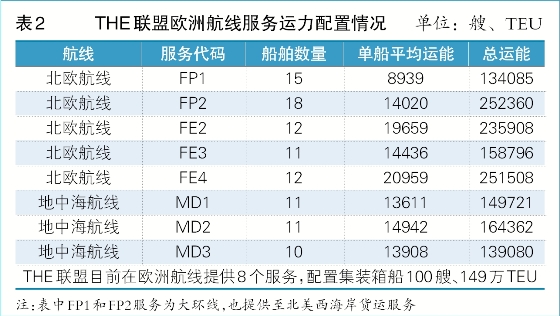 由于新下水大型集装箱船的投运,THE联盟在欧洲航线上可常规提供8个周班服务,配置集装箱船100艘、149万TEU(见表2)。