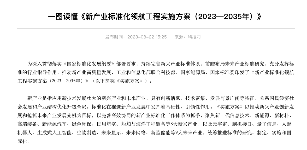 《实施方案》明确提出,以推动新兴产业创新发展和抢抓未来产业发展先机为目标,以完善高效协同的新产业标准化工作体系为抓手,全面推进新兴产业标准体系建设,明确新一代信息技术、新能源、新材料、高端装备、新能源汽车、绿色环保、民用航空、船舶与海洋工程装备等8个新兴产业重点标准研制方向,并以专栏形式细化分解标准研制重点;聚焦元宇宙、脑机接口、量子信息、人形机器人、生成式人工智能、生物制造、未来显示、未来网络、新型储能等9大未来产业,统筹推进标准的研究、制定、实施和国际化。