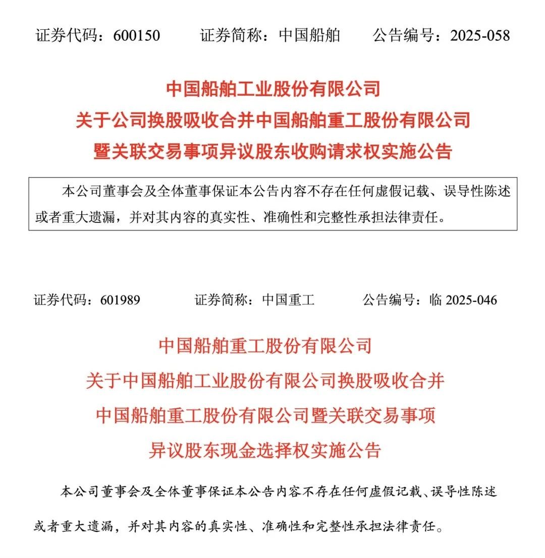 同日,中国重工亦发布公告称,该公司拟被中国船舶吸收合并,导致其不再具有独立主体资格并被注销。根据相关规定,该公司可能向上海证券交易所申请主动终止上市。该公司股票将自2025年8月13日(即异议股东现金选择权申报日)开市起连续停牌,直至终止上市,不再复牌。2025年8月12日为该公司A股股票最后一个交易日。