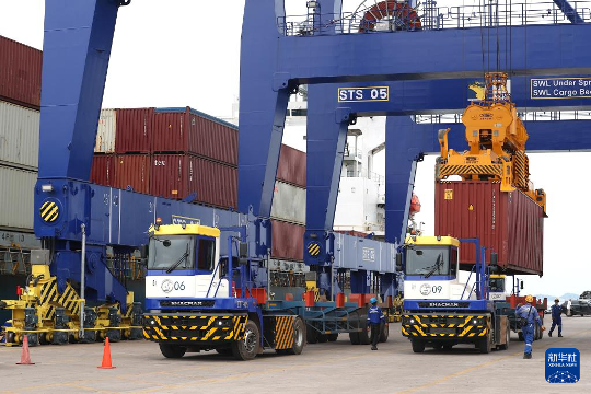 8月21日,在印度尼西亚巴淡岛港,中远海运集团新开辟的巴淡岛港至中国海南洋浦港直航航线的首航集装箱货轮在码头装卸货。新华社记者 岑云鹏 摄