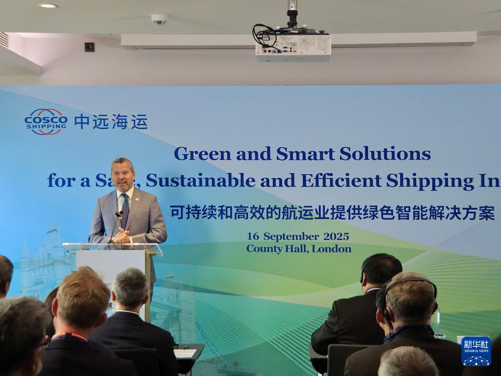 9月16日,在英国伦敦举行的“为安全、可持续和高效的航运业提供绿色智能解决方案”主题论坛上,国际海事组织秘书长阿塞尼奥·多明戈斯发表致辞。新华社发(马宇葳摄)