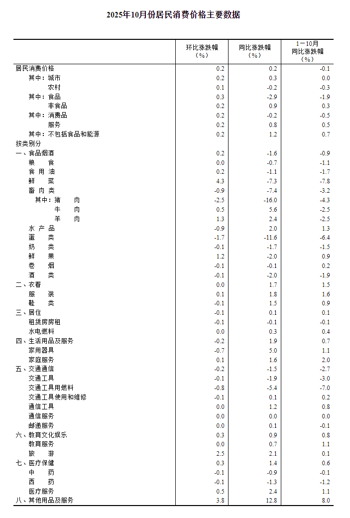 2025年10月份,全国居民消费价格同比上涨0.2%。其中,城市上涨0.3%,农村下降0.2%;食品价格下降2.9%,非食品价格上涨0.9%;消费品价格下降0.2%,服务价格上涨0.8%。1--—10月平均,全国居民消费价格比上年同期下降0.1%。