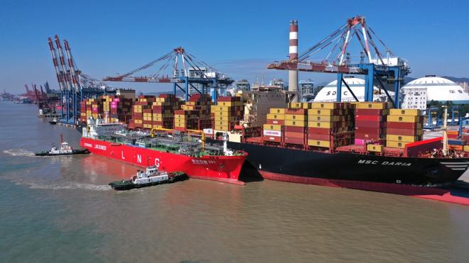 当天11时30分许,厦门港嵩屿集装箱码头,一艘“海洋石油301”轮缓缓靠近停在泊位上的“地中海达莉亚”轮;11时50分许,随着受注船拉响汽笛一声长鸣,此次“船对船”加注作业开始。