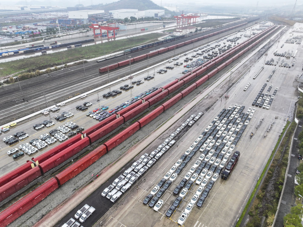2025年2月6日,商品车在重庆鱼嘴站等待装车(无人机照片)。新华社记者 唐奕 摄
