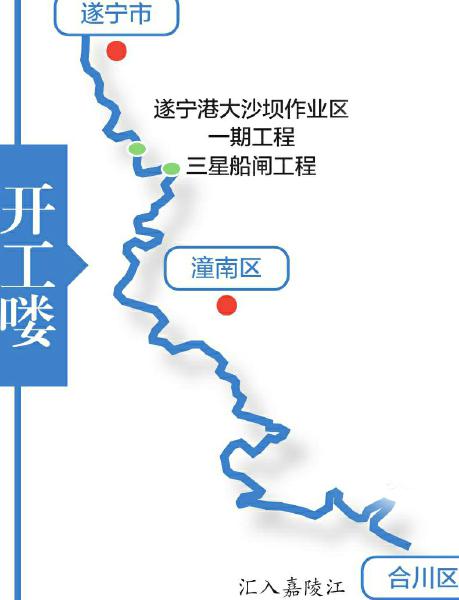 12月29日,遂宁市蓬溪县,涪江之畔,三星船闸工程正式开工。不远处,遂宁港大沙坝作业区一期工程同步开工。随着一闸一港建设,涪江复航迈出关键一步。