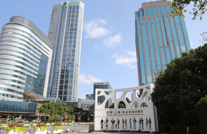 这是位于上海外高桥保税区2号门附近的中国(上海)自由贸易试验区标志雕塑(2022年10月17日摄)。