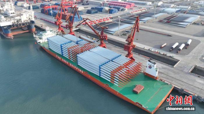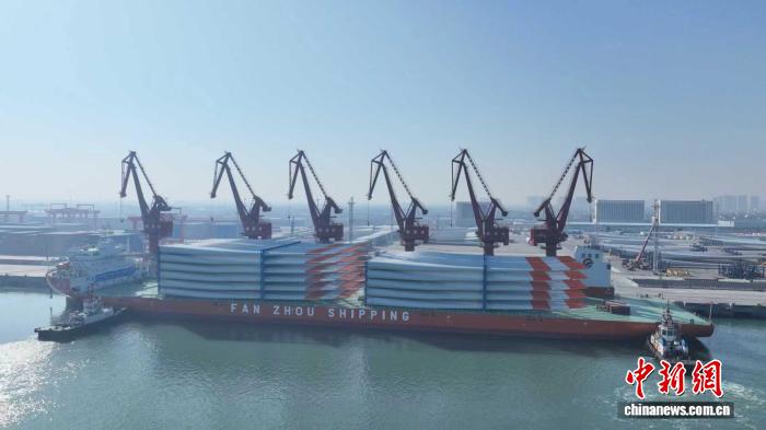 1月13日,在南通海事局的监管维护下,世界最大外贸甲板驳“泛洲7”轮装载132片风电叶片从南通启航,执行首次运输任务(无人机照片)。南通海事局 供图