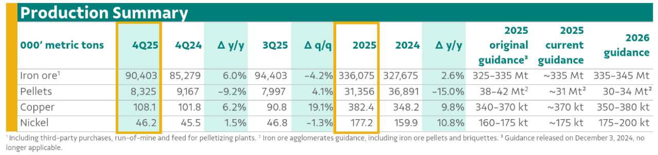 1月27日,淡水河谷发布消息,2025年淡水河谷所有业务均实现强劲运营业绩,超出年初制定的产量指导目标。铁矿石和铜产量达到自2018年以来的最高水平,分别为3.36亿吨和38.2万吨;镍产量亦达到自2022年以来的最高水平,为17.7万吨,这些成果得益于关键项目的达产和持续稳定的运营。