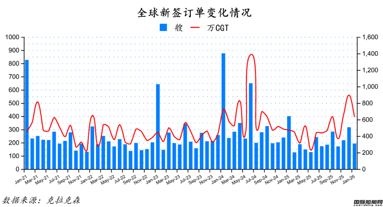 根据克拉克森最新数据统计(截至2026年2月9日),2026年1月份全球新签订单193艘,共计6,382,801CGT。与2025年12月份全球新签订单316艘,共计8,996,938CGT相比较,数量环比减少123艘,修正总吨环比下降29.06%。与2025年1月份全球新签订单400艘,共计4,752,170CGT相比较,数量同比减少207艘,但得益于液化气船订单大增,修正总吨同比上升34.31%。