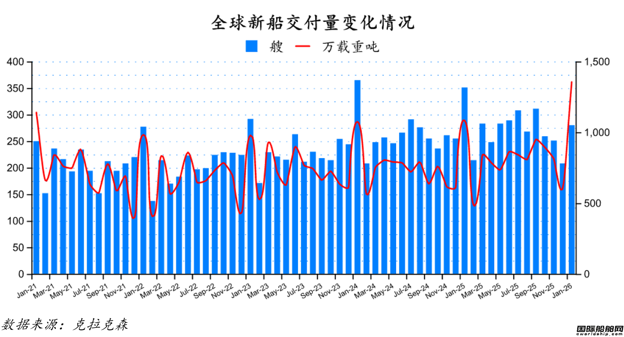 2026年1月份全球船厂共交付新船280艘,共计13,596,402载重吨。与2025年12月份全球新船交付订单208艘,共计6,122,274载重吨相比较,数量环比上升34.62%,载重吨环比上升122.08%。与2025年1月份全球船厂共交付新船351艘,共计10,872,092载重吨相比较,数量同比下跌20.23%,载重吨同比上升25.06%。