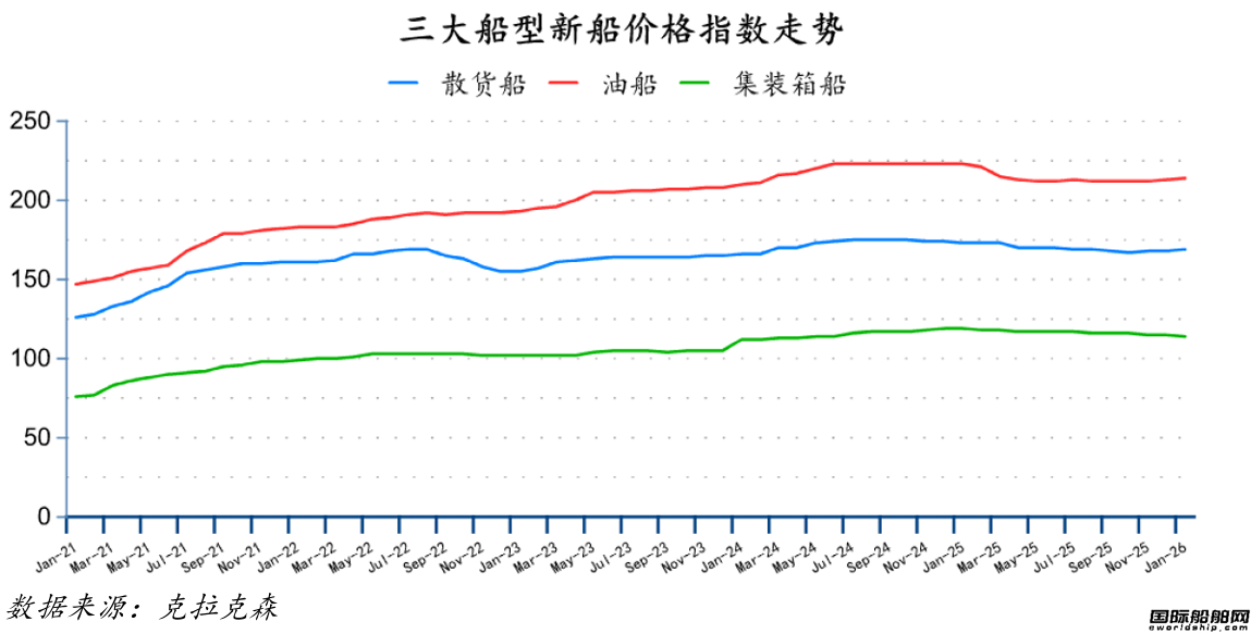 1月份集装箱船新船价格指数环比下跌1点至114点;散货船和油船新船价格指数环比分别上升1点,分别为169点和214点。