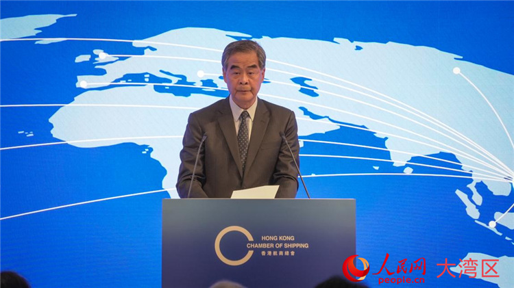 全国政协副主席、香港航商总会荣誉顾问梁振英致辞。人民网 吴宇扬扬摄