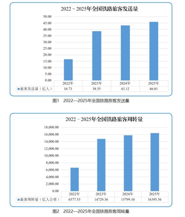 客运方面。2025年,全国铁路累计完成旅客发送量46.01亿人,同比增长6.7%;完成旅客周转量16395.56亿人公里,同比增长3.8%。12月份,完成旅客发送量3.23亿人,同比增长8.5%;完成旅客周转量1015.59亿人公里,同比增长6.0%。