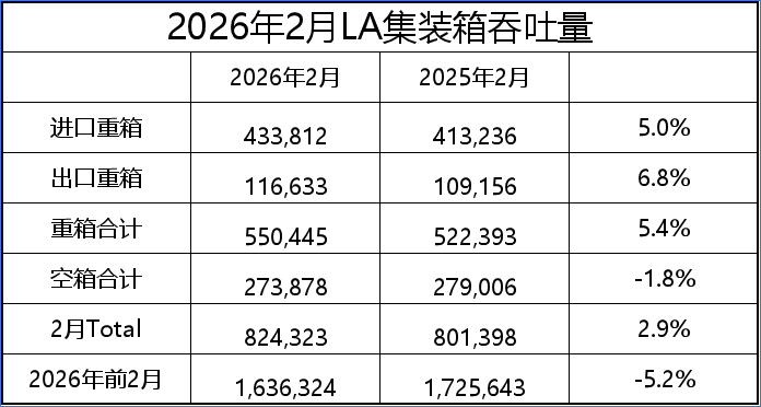 2026年前2个月,洛杉矶港集装箱货运量达到163.6万TEU,同比下降5.2%。