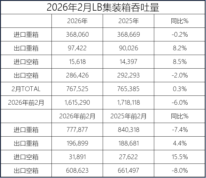2026年前2个月,长滩港处理了161.5万TEU,同比减少6%。