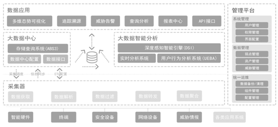 大数据智能安全平台可以滤现出真正有效的攻击和事件,以便管理者进行全面溯源与取证,完成安全事件处置。大数据智能安全平台包括数据采集、大数据智能分析和数据应用三层架构(见图)。